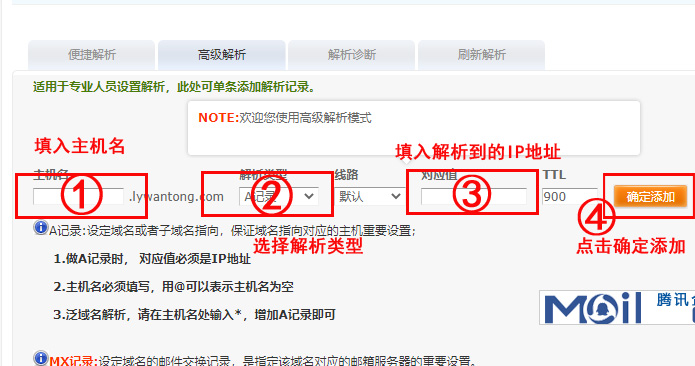 A记录:设定域名或者子域名指向,保证域名指向对应的主机重要设置;