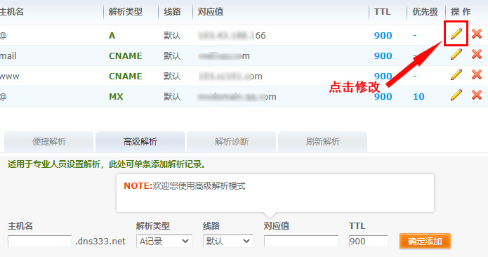 三、修改:进入域名解析面板后,点击笔图样标志、修改对应值,点击提交。