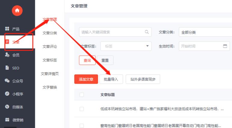 管理后台点击【文章-管理文章】,选择【批量导入】,在上传文章弹窗中点击【下载模板】。如下图: